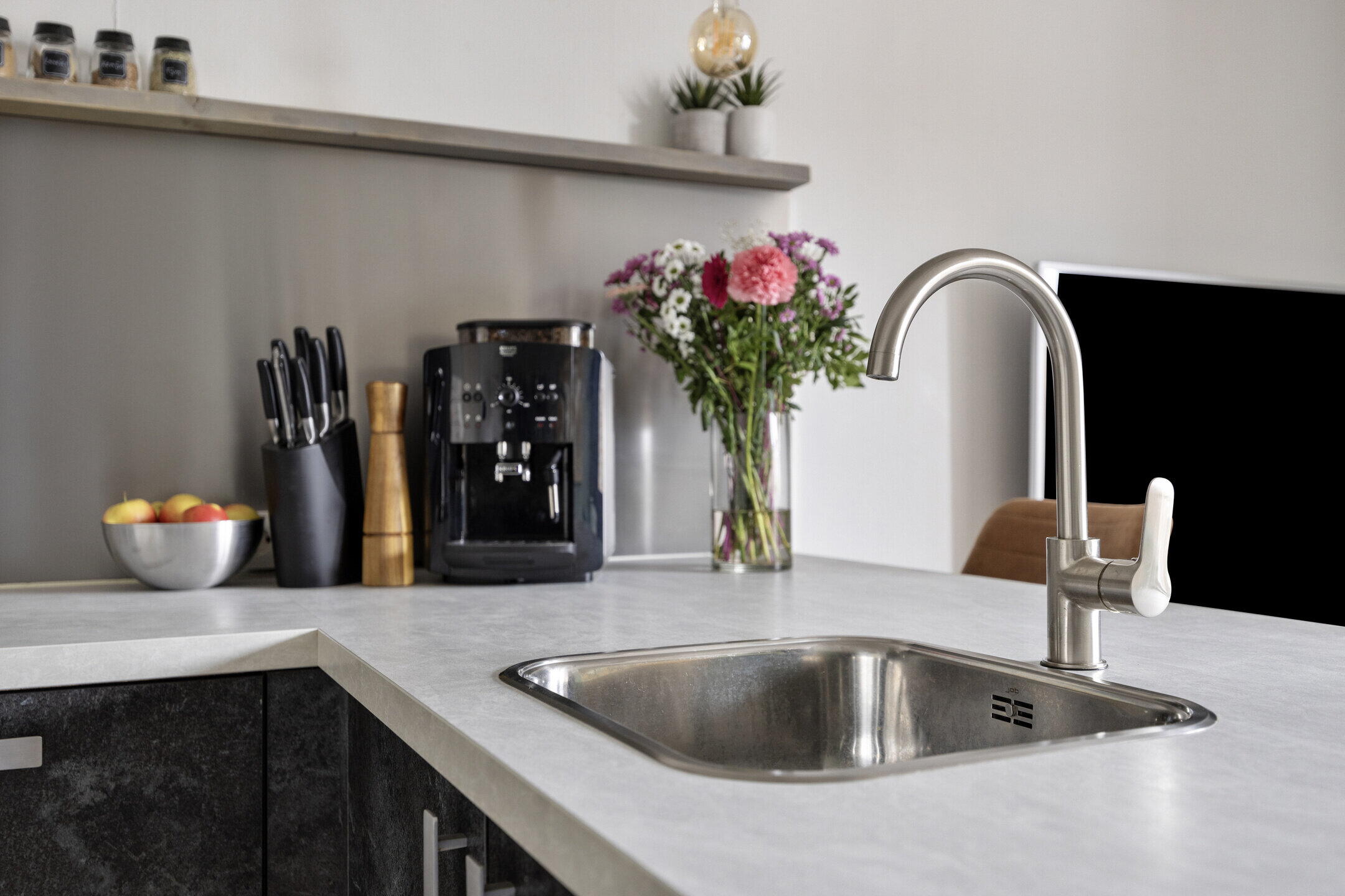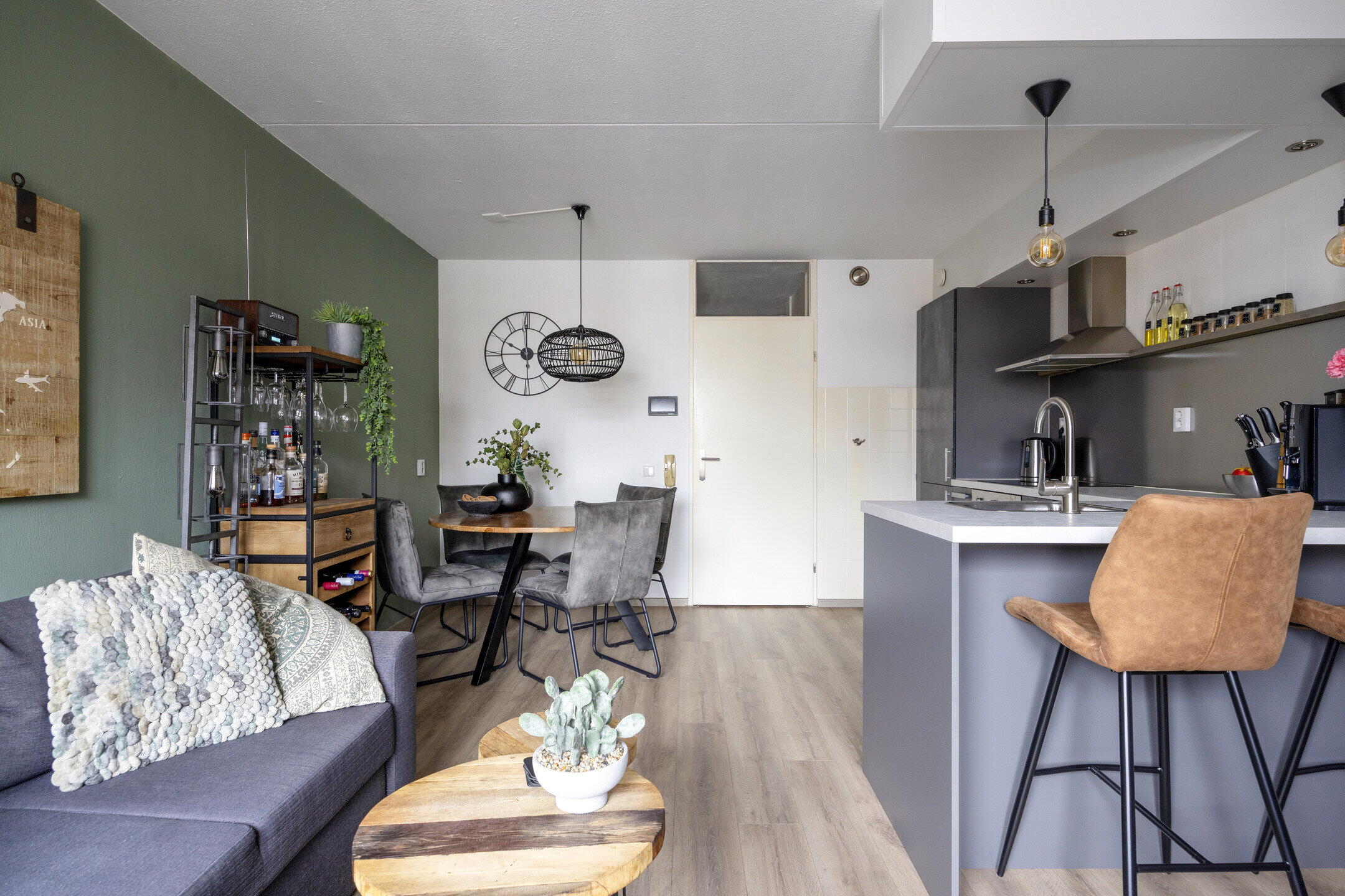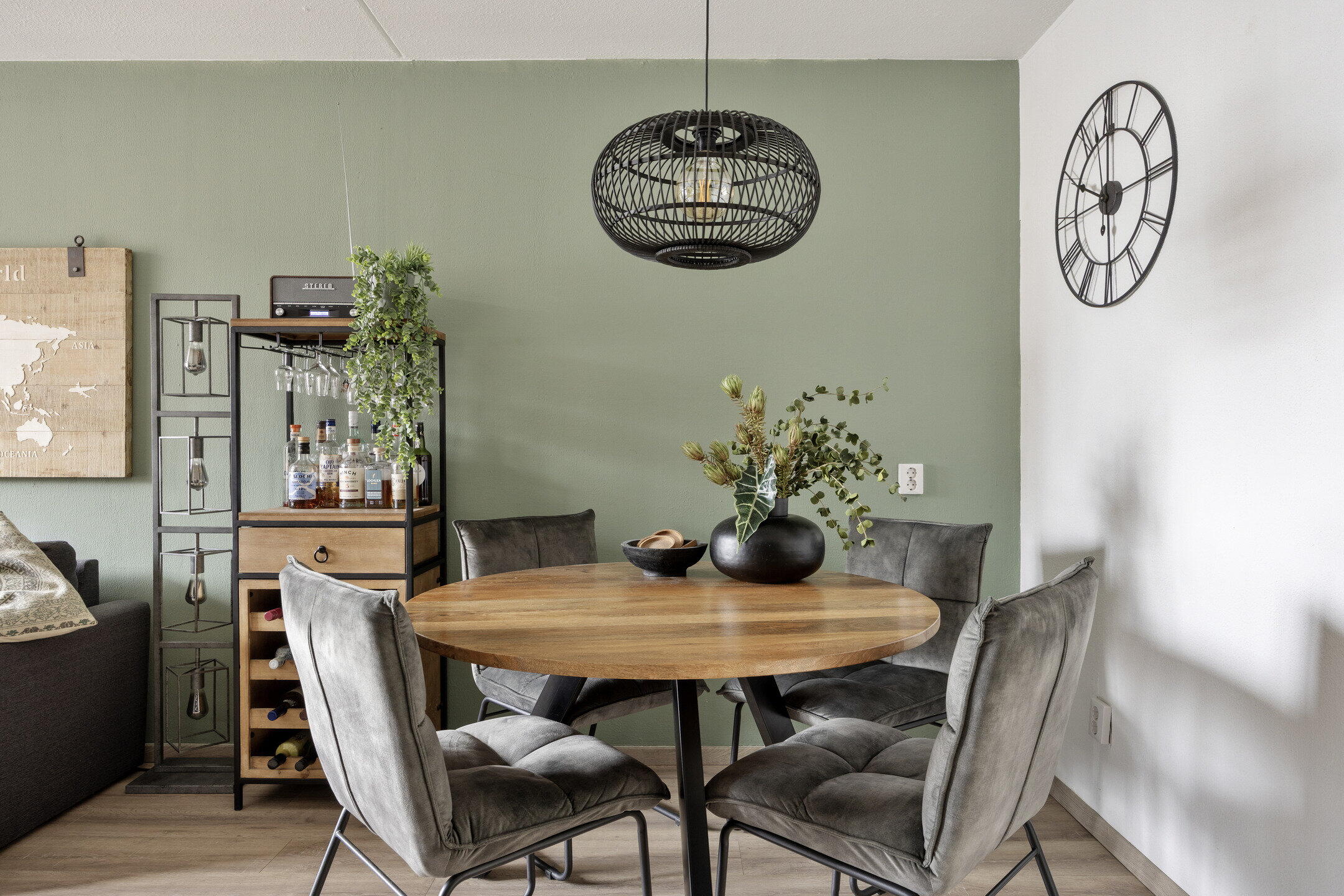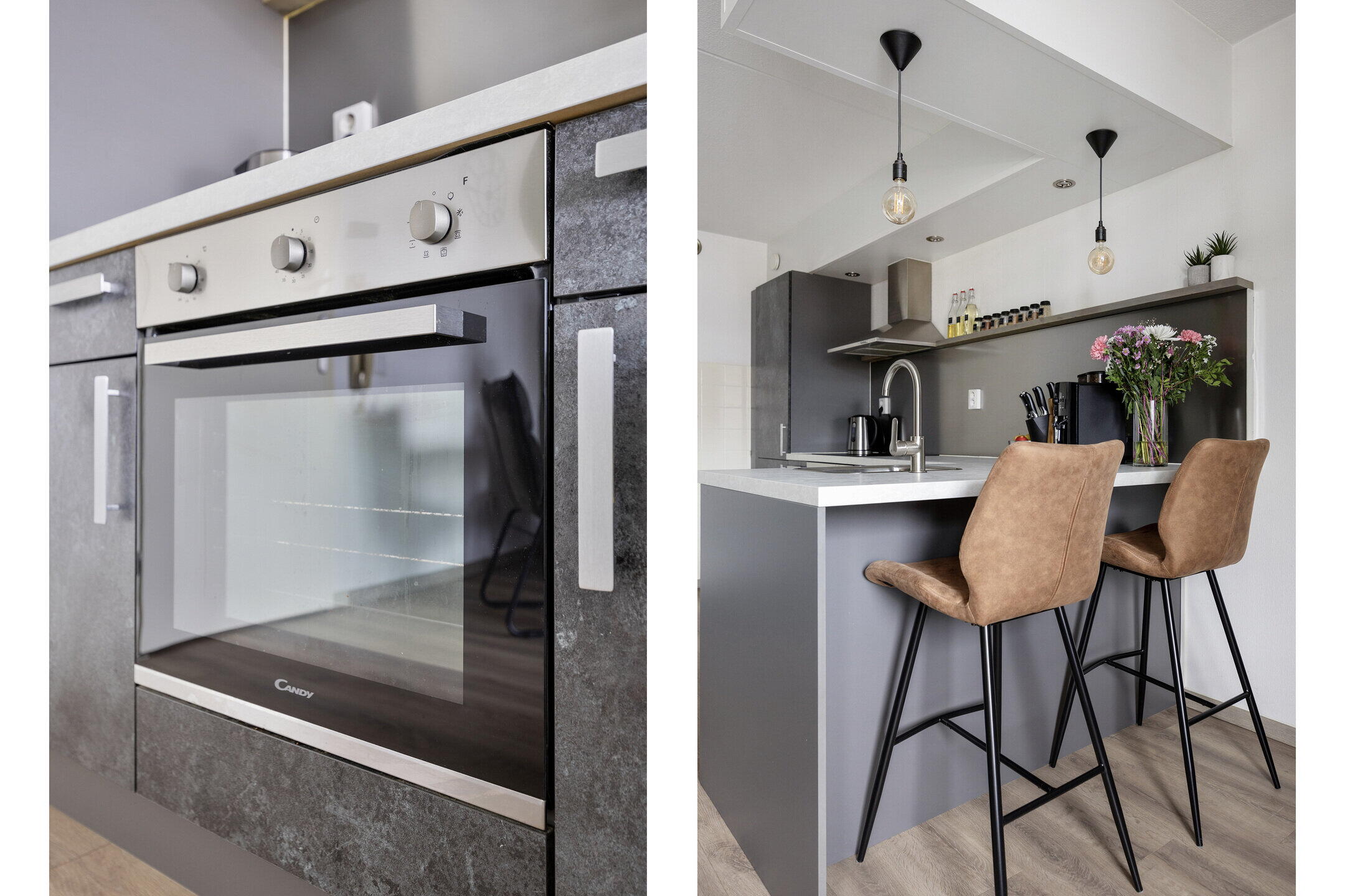 Aan de andere zijde van de woonkamer is ruimte voor een eethoek. Momenteel staat hier een speelse ronde tafel voor vier personen, een gezellige plek om te tafelen met vrienden of familie. De open keuken in L-opstelling sluit naadloos aan op de leefruimte. Door de slimme indeling is er een barretje gecreëerd met plek voor twee stoelen, ideaal voor een snelle koffie of een borrel. De moderne keuken met grijze frontjes en een licht werkblad is voorzien van een kookplaat, afzuigkap, oven, koel-vriescombinatie en vaatwasser. Hier kook je met plezier!