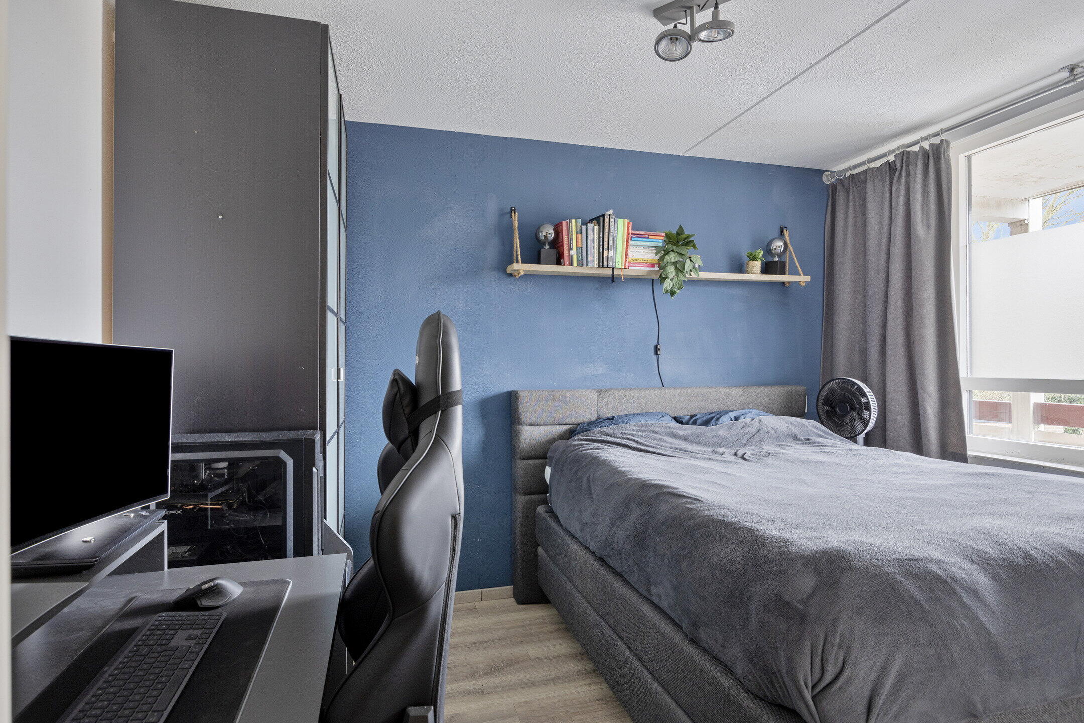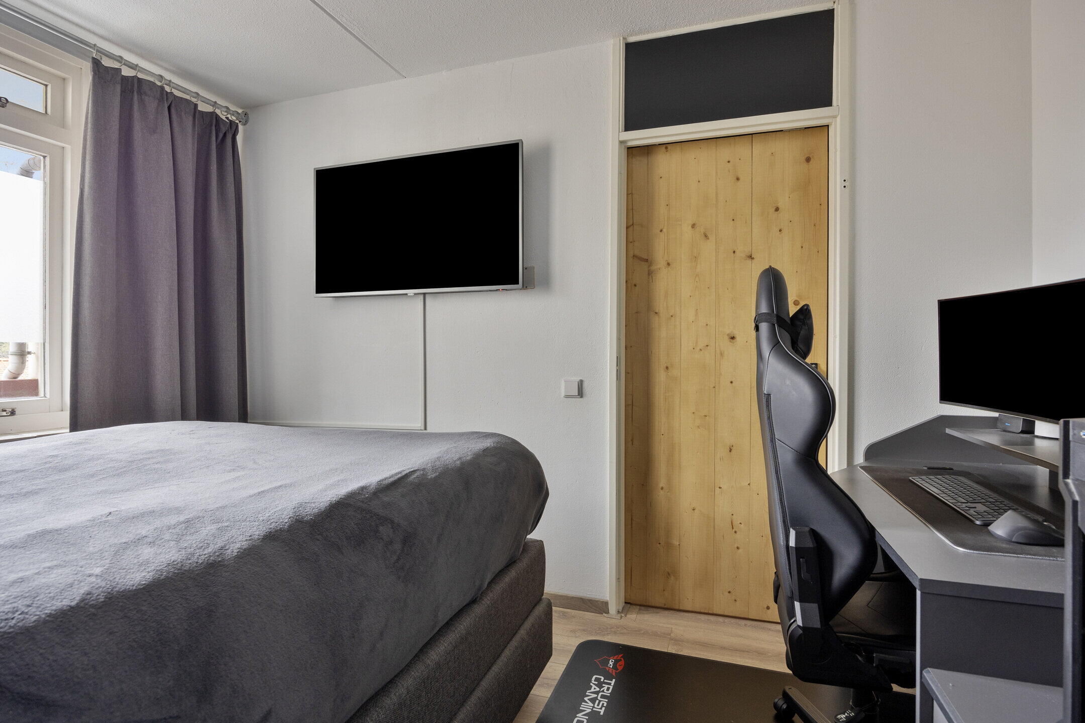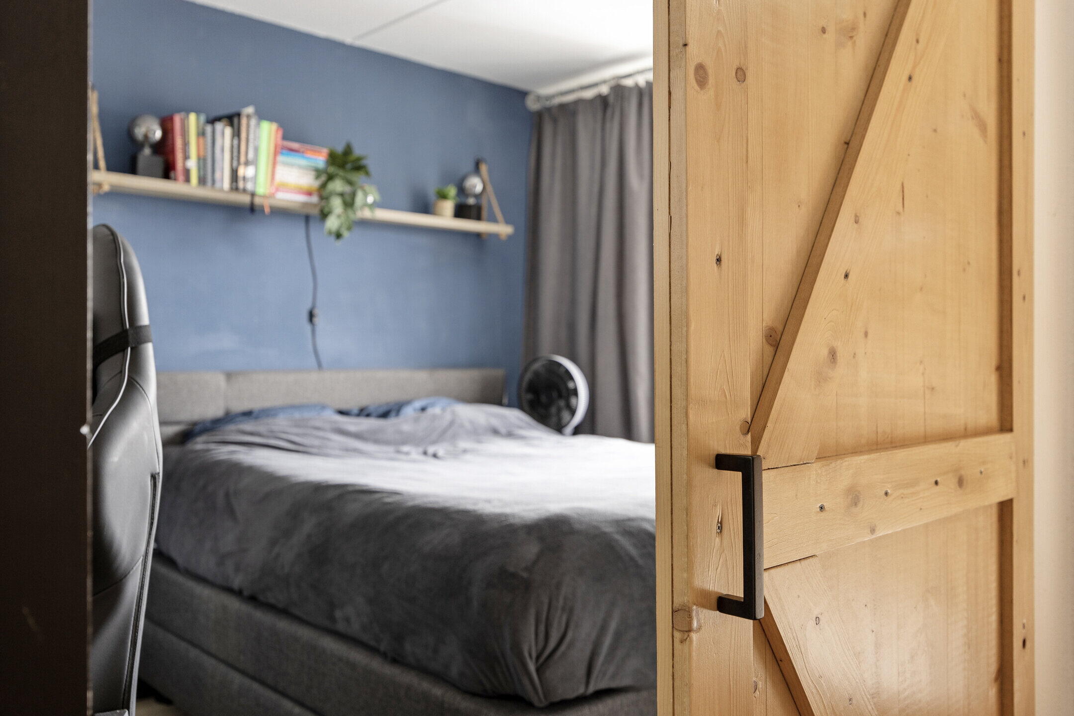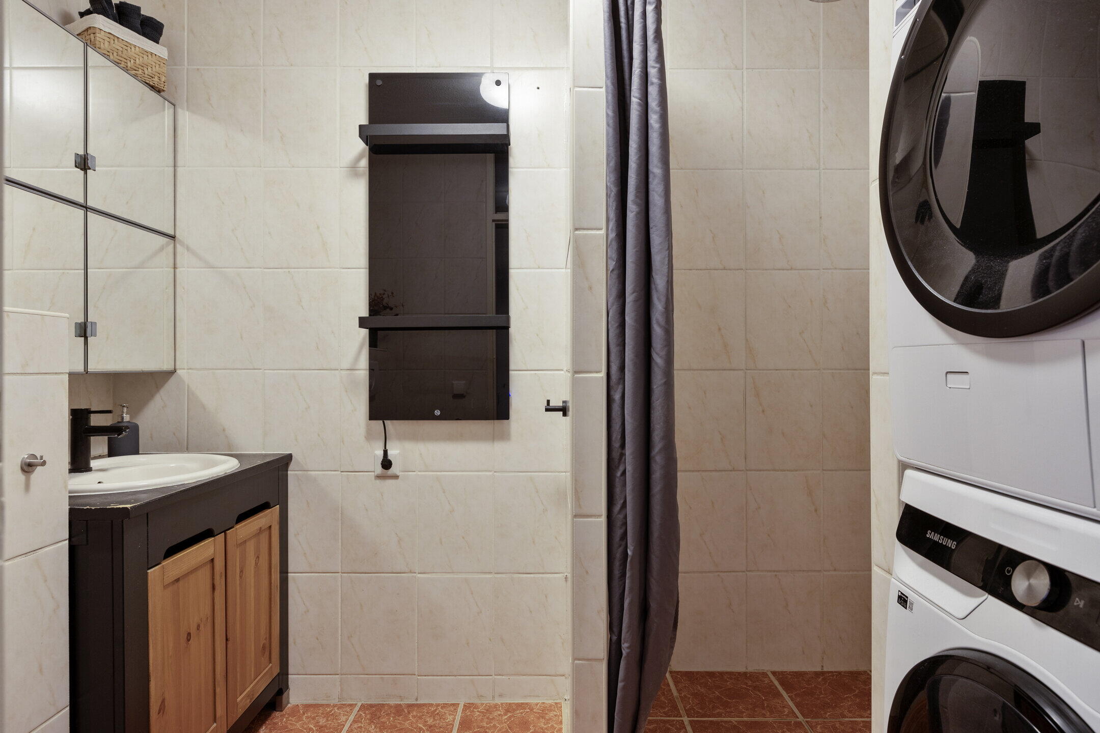 Het appartement beschikt over één slaapkamer, gelegen aan de voorzijde. De ruimte is afgewerkt met een stoere houten industriële schuifdeur, wat zorgt voor karakter en sfeer. Er is voldoende plek voor een tweepersoonsbed, een kledingkast én zelfs een bureau, ideaal voor thuiswerken. De badkamer is praktisch ingericht en voorzien van een wastafel met meubel, douche, toilet en aansluitingen voor wasmachine en droger. Alles wat je nodig hebt, binnen handbereik.