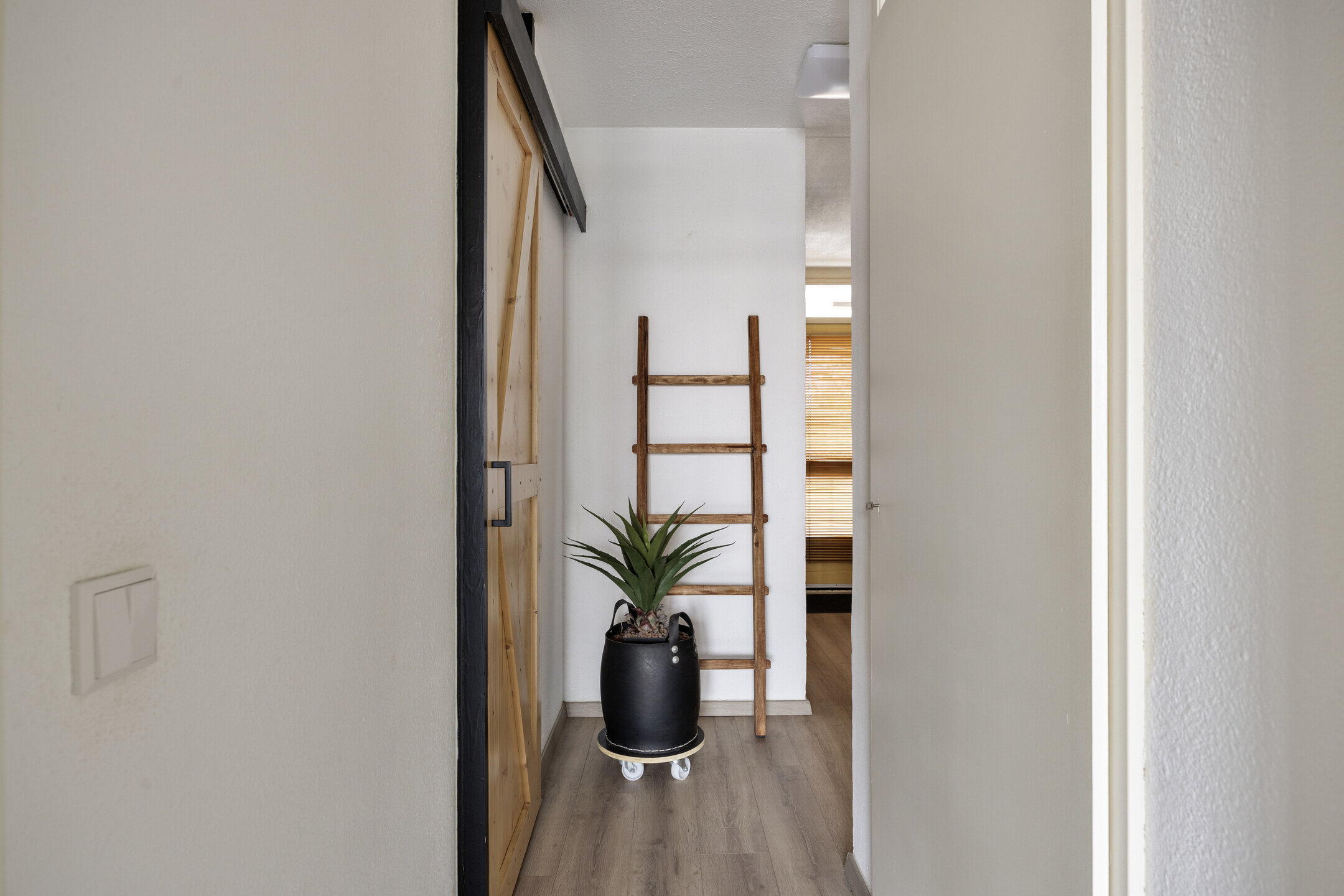 Je komt binnen in de hal, waar direct de nette afwerking en de mooie laminaatvloer opvallen. Vanuit hier heb je toegang tot de slaapkamer, badkamer, meterkast, bergkast en de woonkamer. Alles is praktisch ingedeeld en voelt verzorgd aan.